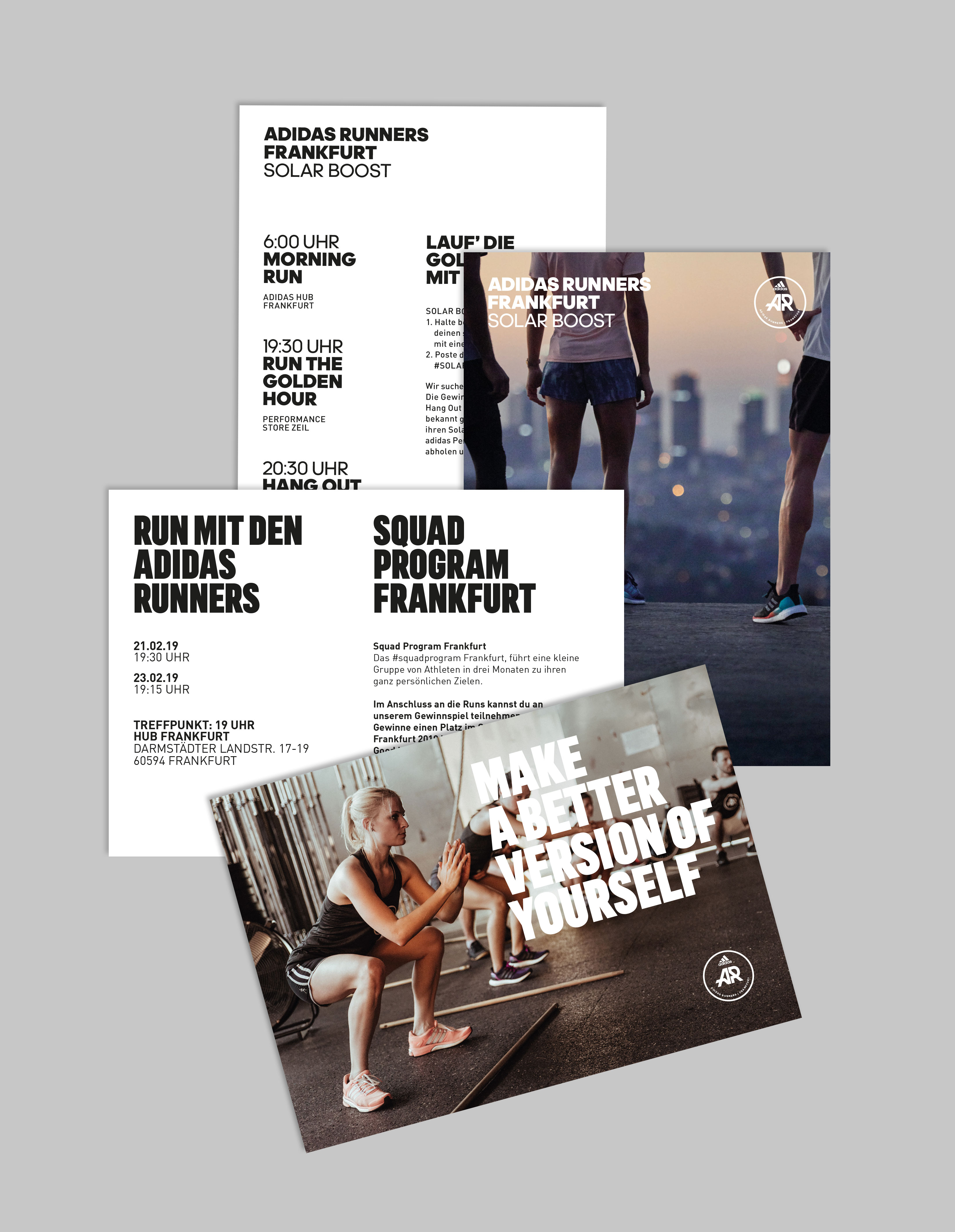 Die adidas Runners sind eine internationale Lauf-Community, welche in vielen großen Städten zusammenkommt. Seit mehreren Jahren betreuen wir die adidas Runners in Frankfurt. Wir begleiten sie bei den unterschiedlichsten Grafikanforderungen für diverse Events. Mal eine Wand, mal ein Hubschrauber, mal eine Lichtinstallation für ein Yogaevent.